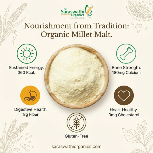At Sri Saraswathi Organics, millet malt is made using organically grown millets sourced from trusted farmers. It is processed without polishing, additives, or chemical preservatives, offering a clean and nourishing malt powder suitable for daily consumption.