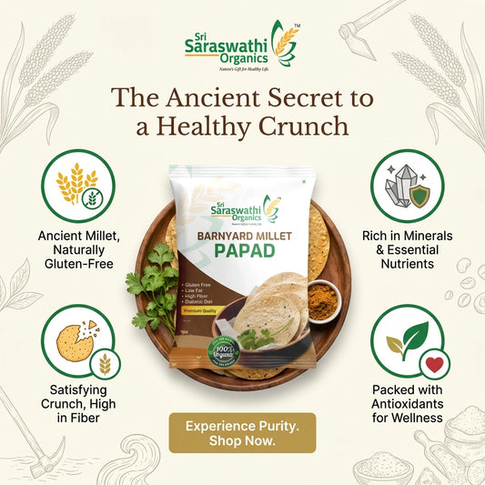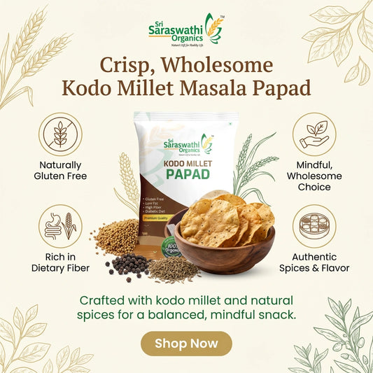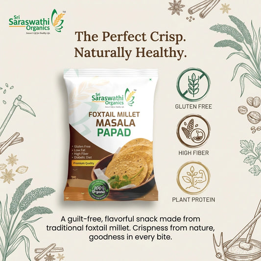 Millet papads can be enjoyed roasted or lightly fried and paired with rice, curries, rasam, or chutneys. At Sri Saraswathi Organics, millet papads are prepared using clean ingredients without artificial colours or preservatives, making them suitable for regular home consumption.