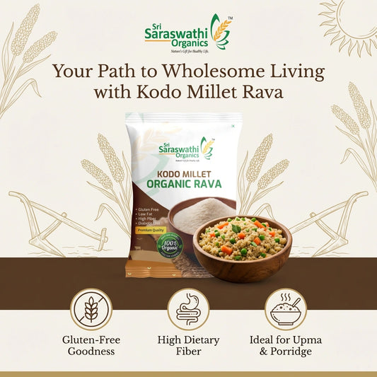 Sri Saraswathi Organics little millet rava always ensures nutritional essence in its every millet grain food range. It has numerous healthy benefits, like a low glycemic index, is rich in fiber, and contains essential plant protein.